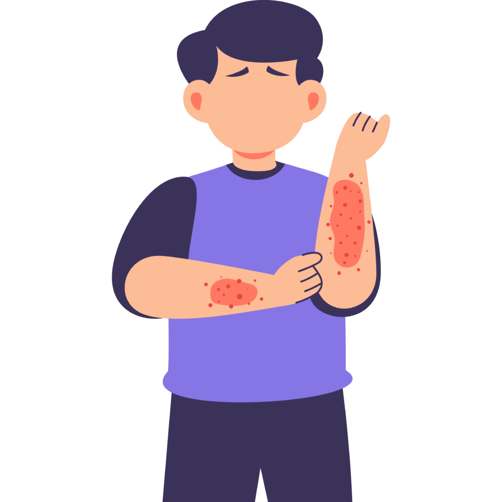 Pele ressecada, vermelhidão, coceira intensa, feridas por coçar, especialmente nas dobras dos braços, pernas e pescoço.